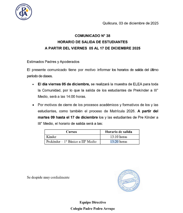 - COMUNICADO N° 38 HORARIO DE SALIDA DE ESTUDIANTES A PARTIR DEL VIERNES 05 AL 17 DE DICIEMBRE 2025